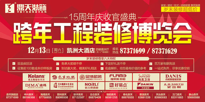 裝修“抄底”在年終;年終“抄底”當(dāng)擇鼎天裝飾跨年裝修博覽會(huì);如果這場(chǎng)活動(dòng)正又巧是鼎天裝飾15周年慶收官盛會(huì),那就更是“抄底”中的“抄底”。12月13日(周六),鼎天裝飾15周年慶收官盛典之2014跨年裝修博覽會(huì)強(qiáng)勢(shì)來(lái)襲。如果您想要裝修裝得漂亮、裝得省錢(qián)、裝得安心,那就一定要抽個(gè)時(shí)間來(lái)凱洲大酒店四樓嘉洲廳參加這場(chǎng)家裝盛會(huì)。到訪(fǎng)就有禮哦! 鼎天“跨年裝修”說(shuō):五大利 一利,規(guī)避高峰,細(xì)工出精品:一到年底,公司往往進(jìn)入休整期,這個(gè)時(shí)間段,設(shè)計(jì)師和施工師傅會(huì)相對(duì)空閑,加之客戶(hù)不急于入住,利于細(xì)工出精品。 二利,跨年施工好處多:如冬季氣候干燥,空氣濕度最小,年前做完水電、泥工、木工等基礎(chǔ)工程,春節(jié)長(zhǎng)假歇工半個(gè)月后,新砌墻、現(xiàn)澆樓板、線(xiàn)槽封蓋等都會(huì)充分晾干,對(duì)防止開(kāi)裂、發(fā)霉等問(wèn)題十分有利。 三利,裝修省錢(qián)大招:裝修建材、人工費(fèi)一年一個(gè)價(jià),最近幾年更是年年有所上漲,跨年裝修有利避免年后漲價(jià)風(fēng)波。 四利,上規(guī)模的品牌家裝公司,讓業(yè)主放心裝修。在這場(chǎng)跨年裝修活動(dòng)中,鼎天裝飾不僅安排了豪華設(shè)計(jì)師陣容,并推出“在裝工地體驗(yàn)”活動(dòng),開(kāi)通百套實(shí)景樣板房直通車(chē),讓業(yè)主們現(xiàn)場(chǎng)體驗(yàn)不同風(fēng)格、不同戶(hù)型、不同施工階段的裝修,聆聽(tīng)設(shè)計(jì)師的設(shè)計(jì)講解,感受真實(shí)空間的設(shè)計(jì)元素布局,切實(shí)保障跨年裝修品質(zhì)。 五利,知名樓盤(pán)小區(qū)設(shè)計(jì)案例年終匯總發(fā)布?,F(xiàn)場(chǎng)將提供諸如青林灣、維科上院、鈺鼎園、蘇園、印象外灘、世茂首府、三水灣、悅瀾灣、星河國(guó)際、君瀾上府、榮安心居、鉑翠灣、東海府、集成廣場(chǎng)、紫玉花園、君雅苑、薛家新家園、金色瓏庭、東都華庭、光大江灣府第、金橋水岸、公元世家、南熙園、宜家花園、晴園、麗景英郡、保利城、永和居易、芳辰麗陽(yáng)、華城花園、蝶園、IN藍(lán)庭、雷迪森廣場(chǎng)、英倫水岸、東湖觀邸、皇冠花園、盛世天城、江南一品、雍城世家、水岸楓情、BOBO城、風(fēng)格城事、上上城等甬城眾多中高端小區(qū)。 家裝建材聯(lián)盟,拿禮拿到手軟 本屆跨年家裝活動(dòng),鼎天裝飾將與一線(xiàn)品牌建材戰(zhàn)略聯(lián)盟,強(qiáng)勢(shì)力推“跨年裝修六大禮”:到訪(fǎng)禮、集章禮、連購(gòu)禮、現(xiàn)金禮、簽單禮及免單大獎(jiǎng),品牌建材涵蓋瓷磚、地板、櫥柜、吊頂、衛(wèi)浴、窗簾等全部品類(lèi)。 參加這場(chǎng)跨年家裝活動(dòng),肯定讓前來(lái)的業(yè)主們拿禮拿到手軟。進(jìn)入展廳,就先拿一份“見(jiàn)面禮”;集齊10枚紀(jì)念章還可再領(lǐng)取一份實(shí)物禮;現(xiàn)場(chǎng)下定,再享交定金返現(xiàn)金優(yōu)惠,即所謂現(xiàn)金派送禮;憑鼎天裝飾定單,還可參與砸金蛋得免單大獎(jiǎng),大獎(jiǎng)包含建材、家電、工程抵用款等心動(dòng)大獎(jiǎng)。此外,在活動(dòng)現(xiàn)場(chǎng)購(gòu)買(mǎi)聯(lián)盟建材還享受聯(lián)購(gòu)禮,根據(jù)聯(lián)購(gòu)的建材品類(lèi)數(shù)量,免費(fèi)收獲電飯煲、洗衣機(jī)、液晶電視等家電大禮。如此多重大禮,只有在年底收官之時(shí),才能暢享;也只有在鼎天裝飾跨年裝修博覽會(huì),才能遇上!惠民強(qiáng)襲,裝修還在等什么! 跨年裝修“省錢(qián)利器”美艷5號(hào)、8號(hào)精裝套餐 此次活動(dòng),鼎天美艷5號(hào),以及針對(duì)都市白領(lǐng)、經(jīng)典婚房、大平層及改善型裝修的美艷8號(hào)精裝套餐,將聯(lián)袂“省錢(qián)”跨年裝修。 鼎天美艷5號(hào)精裝套餐專(zhuān)為15周年大慶特意打造,實(shí)景房已全面向裝修業(yè)主們開(kāi)放,這套歷時(shí)半年規(guī)劃的作品,集合了鼎天至尊工作室強(qiáng)大的設(shè)計(jì)力量,以呈現(xiàn)當(dāng)代人居嶄新美學(xué)為目標(biāo),吸引了甬城眾多業(yè)主的目光。它在價(jià)格、設(shè)計(jì)、施工、建材品牌選用等環(huán)節(jié)上的精細(xì)規(guī)劃和精益求精,比常規(guī)裝修節(jié)省了400-500元/平方米費(fèi)用,而且它讓裝修更輕松、簡(jiǎn)便,更讓人放心,即使再挑剔的裝修客也是見(jiàn)之欣喜。 特別預(yù)告: 12月13日(周六)9:00---17:00,鼎天裝飾在凱洲大酒店四樓嘉洲廳(天一廣場(chǎng)南面)舉辦“15周年慶收官盛典暨跨年裝修博覽會(huì)”,現(xiàn)場(chǎng)限量征集前100套鼎天15周年“感恩特惠”“跨年家裝”樣板房,并以成本價(jià)為其裝修,且由鼎天至尊工作室、金牌施工團(tuán)隊(duì)聯(lián)手打造完美家裝樣板工程?,F(xiàn)場(chǎng)還尊享一站式家裝建材購(gòu)齊服務(wù),優(yōu)惠史無(wú)前例! 樣板房報(bào)名熱線(xiàn):87371629 貴賓熱線(xiàn):87371699
