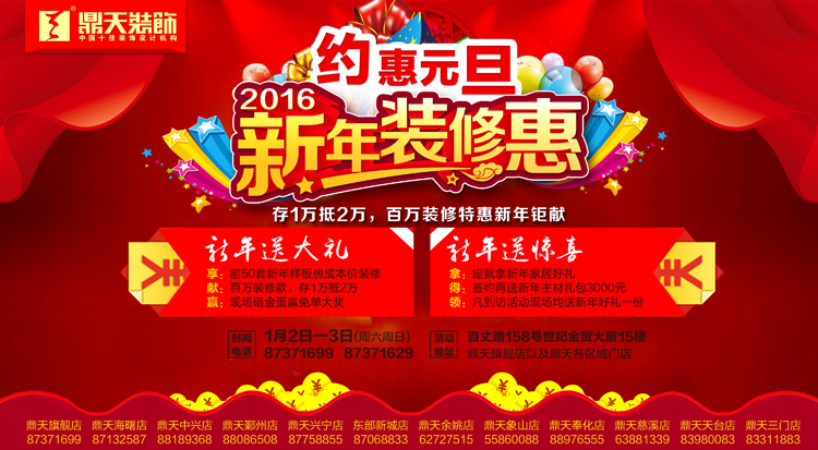 新春總有各種驚喜,新家裝修同樣有驚喜!1月2日—3日(周六/周日),鼎天裝飾2016新年裝修“惠”,大牌任性送禮,要裝修的您趕緊開(kāi)搶! 新年裝修主要看:優(yōu)惠 1月2日—3日(周六/周日),鼎天裝飾各門(mén)店將舉辦“2016新年裝修“惠”活動(dòng),現(xiàn)場(chǎng)任性送禮。為迎新答謝,鼎天裝飾向全甬城待裝修客戶發(fā)出50套新年樣板房征集令,以成本價(jià)為其裝修;當(dāng)日下單, 2016年裝修享2015年的裝修基礎(chǔ)材料價(jià)格和人工費(fèi),新舊交替,讓您的裝修成本不漲價(jià),名額僅限前50戶。其次,還享預(yù)存定金超值優(yōu)惠,最高存1萬(wàn)抵2萬(wàn)元工程款?!叭涡浴本痛私Y(jié)束?還沒(méi)呢,下單客戶還能再享3000元新年主材禮包,這3000元可以購(gòu)買(mǎi),瓷磚、地板、櫥柜、窗簾等?;顒?dòng)中,還有眾多新年新大禮奉上。裝修特惠駕到,您到了嗎? 此次活動(dòng)鼎天裝飾將在寧波城區(qū)、北侖、奉化、余姚、慈溪、天臺(tái)、三門(mén)、象山等十六店同慶。 新房裝修主要看:品質(zhì) 這場(chǎng)新年裝修“惠”,鼎天裝飾不光送上大禮,還要送上品質(zhì),送上貼心服務(wù)。活動(dòng)中,鼎天裝飾攜“至尊工作室”豪華設(shè)計(jì)師陣容亮相,并推出“在裝工地體驗(yàn)”活動(dòng)。開(kāi)通百套實(shí)景樣板房直通車,讓業(yè)主們現(xiàn)場(chǎng)體驗(yàn)不同風(fēng)格、不同戶型、不同施工階段的裝修,聆聽(tīng)設(shè)計(jì)師的設(shè)計(jì)講解,感受真實(shí)空間的設(shè)計(jì)元素布局。這樣的實(shí)力,絕對(duì)保障您的家裝在設(shè)計(jì)、工程上的品質(zhì)。 現(xiàn)場(chǎng),業(yè)主們還可品鑒鼎天裝飾在諸多知名小區(qū)中打造的數(shù)千套優(yōu)秀案例,如青林灣、寰宇天下、東海府、濱江府、景瑞上府、羅蒙環(huán)球城、鉑翠灣、東方一品、天境花園、海外灘、新外灘一號(hào)、中海國(guó)際社區(qū)、銘豪觀樾、維科上院、鈺鼎園、蘇園、印象外灘、星河國(guó)際、舒沁苑、樂(lè)筑良品、君和院、銀億東岸、風(fēng)格尚品、盛世華府、金億文園、悅瀾灣、景瑞望府、君瀾上府、榮安心居、藏瓏、締壹城、君園和莊、山清軒、銀億上郡、文瀾水岸、左岸尚苑、金色江山、水榭花都、紫玉花園、麗江苑、君雅苑、金色瓏庭、東都華庭、宜家花園、晴園、麗景英郡、保利城、芳辰麗陽(yáng)、英倫水岸、東湖觀邸、盛世天城、江南一品、雍城世家、上上城等甬城名小區(qū)。大牌就是這么有底氣! 同時(shí),還有鼎天美艷5號(hào)、美艷8號(hào)、美艷1號(hào)、美艷999精裝套餐作品,也將聯(lián)袂為您送上新春祝福——致力為甬城業(yè)主打造省錢(qián)、省心、省力裝修! 特別預(yù)告: 1月2日—3日(周六/周日),鼎天裝飾在各門(mén)店舉辦“2016新年裝修“惠”活動(dòng),現(xiàn)場(chǎng)限量征集前50套“新年特惠”樣板房,以成本價(jià)為其裝修!既可享受新年裝修特惠,還將避免年后材料、人工費(fèi)漲價(jià)行情,且由鼎天至尊工作室、金牌施工團(tuán)隊(duì)聯(lián)手打造完美家裝樣板工程。 樣板房報(bào)名熱線:87371629 貴賓熱線:87371699 |