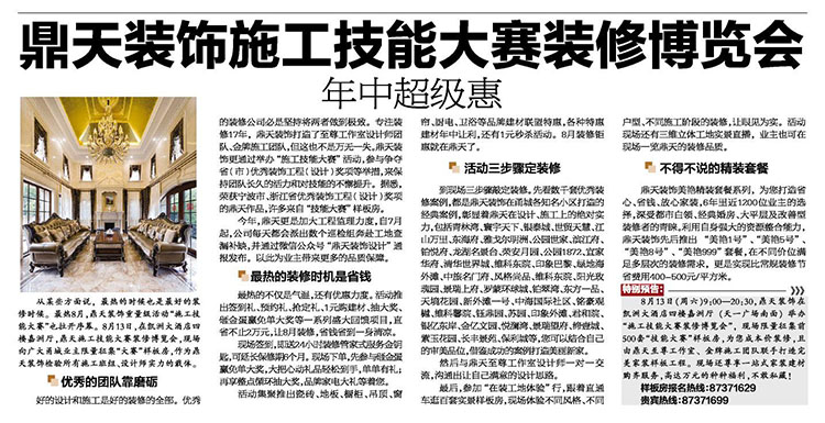 8月13日,在凱洲大酒店四樓嘉洲廳,鼎天裝飾重量級(jí)活動(dòng)"施工技能大賽"將拉開序幕。最熱8月,用最熱的力度給甬城的廣大業(yè)主帶來年中裝修超級(jí)盛惠。 直省不止2萬