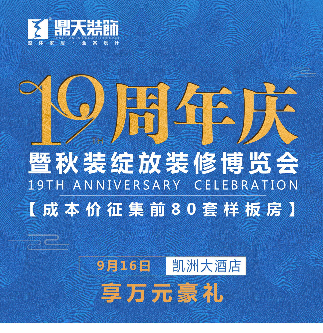 特別預(yù)告:9月16日(周日)9:00-17:00,鼎天裝飾在凱洲大酒店四樓嘉洲廳(天一廣場(chǎng)南面)舉辦“19周年慶暨秋裝綻放裝修博覽會(huì)”活動(dòng),現(xiàn)場(chǎng)限量征集前80套成本價(jià)樣板房,且悅享百萬裝修特惠,并由鼎天至尊工作室、金牌施工團(tuán)隊(duì)聯(lián)手打造完美家裝樣板工程?,F(xiàn)場(chǎng)還尊享一站式家裝建材購齊服務(wù)。種種福利,燃爆9月!樣板房報(bào)名熱線:87371629 貴賓熱線:87371699 |