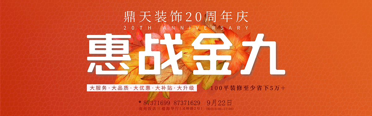 特別預(yù)告: 9月22日(周日)13:00-17:00,鼎天裝飾將在南苑飯店三樓海華廳(靈橋路2號(hào))舉辦“20周年慶”活動(dòng),現(xiàn)場(chǎng)征集前60套成本價(jià)樣板房,悅享萬(wàn)元豪華禮包。鼎天至尊工作室、金牌施工團(tuán)隊(duì)聯(lián)手打造完美家裝樣板工程。現(xiàn)場(chǎng)尊享一站式家裝建材購(gòu)齊服務(wù)。 樣板房報(bào)名熱線:87371629 貴賓熱線:87371699 |