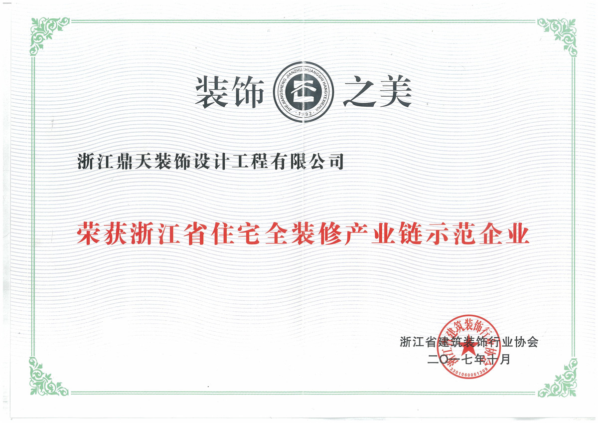 | 鼎天裝飾入選浙江省住宅全裝修產(chǎn)業(yè)鏈?zhǔn)痉镀髽I(yè) |