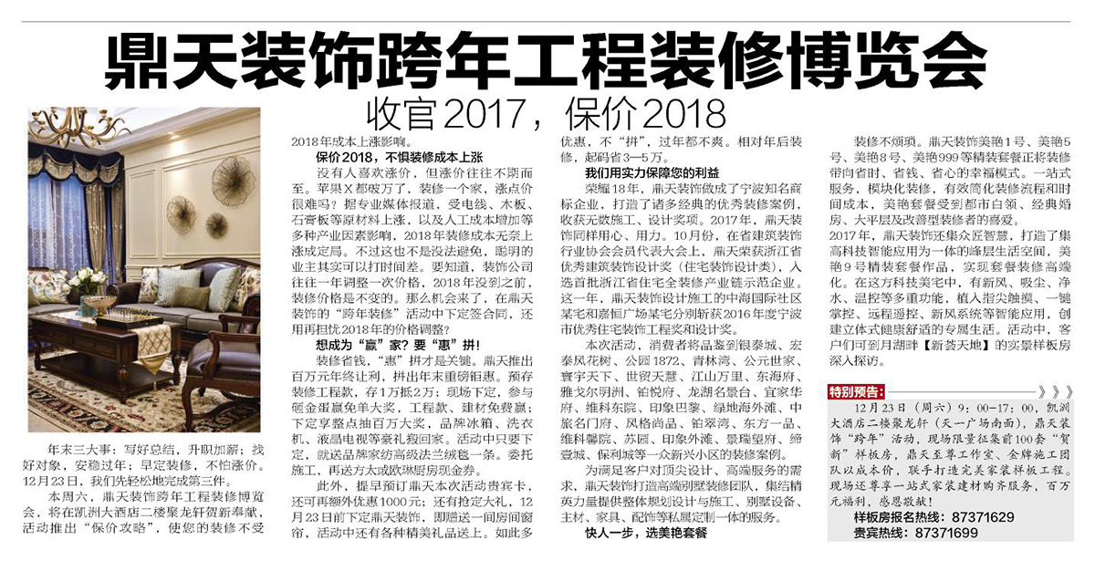 有不少人在2018年前下定裝修,即使他們的房子還要等三四個(gè)月才能交付。這不是因?yàn)樾募?,而是這樣的選擇更實(shí)惠。據(jù)行業(yè)媒體報(bào)道,2018年裝修成本上漲已成定局。所以,聰明的人就搶定裝修,避開2018年的漲價(jià),這是憑本事省下的錢。 保價(jià)盛惠,裝修之選 12月23日,鼎天裝飾跨年工程裝修博覽會(huì),在凱洲大酒店二樓聚龍軒賀新奉獻(xiàn),活動(dòng)推出“保價(jià)攻略”:當(dāng)日下定,裝修免受2018年成本上漲影響。 當(dāng)天,活動(dòng)還有百萬元年終讓利,拼出年末重磅鉅惠。首先,預(yù)存裝修工程款,存1萬抵2萬,翻倍升值;委托施工,再送方太或歐琳廚房現(xiàn)金券?,F(xiàn)場(chǎng)下定者,砸金蛋贏免單大獎(jiǎng),關(guān)鍵是每個(gè)金蛋都有驚喜。此外,下定者還享有整點(diǎn)抽大獎(jiǎng)機(jī)會(huì),品牌冰箱、洗衣機(jī)、液晶電視等豪禮抽不停。特別提醒,12月23日前,預(yù)訂鼎天裝飾跨年活動(dòng)貴賓卡,額外再享1000元優(yōu)惠,外加贈(zèng)送一間房間窗簾?;顒?dòng)現(xiàn)場(chǎng)還有各種精美禮品一并送上。相對(duì)年后裝修,起碼省3—5萬。 2018年,用實(shí)力做甜心管家 鼎天裝飾始終堅(jiān)持用更好的材料,更精湛的工藝,打造精品工程、樣板工程,用實(shí)在品質(zhì)贏取客戶的心。2017年,鼎天裝飾美艷1號(hào)、美艷5號(hào)、美艷8號(hào)、美艷999等精裝套餐,繼續(xù)為都市白領(lǐng)、經(jīng)典婚房、大平層及改善型客戶,帶來省時(shí)、省錢、省心的幸福裝修模式。 這一年,鼎天裝飾還實(shí)現(xiàn)精裝套餐高端化,打造了峰層生活空間【美艷9號(hào)】。這款套餐融新風(fēng)、吸塵、凈水、溫控等多重功能,植入指尖觸摸、一鍵掌控、遠(yuǎn)程遙控、新風(fēng)系統(tǒng)等智能應(yīng)用,創(chuàng)建立體式健康舒適的專屬生活?;顒?dòng)中,客人們可到實(shí)景樣板房探訪。 2017年,鼎天裝飾的設(shè)計(jì)師和施工團(tuán)隊(duì)足跡遍及銀泰城、宏泰風(fēng)花樹、公園1872、青林灣、公元世家、寰宇天下、世貿(mào)天慧、江山萬里、東海府、雅戈?duì)柮髦?、鉑悅府、龍湖名景臺(tái)、宜家華府、維科東院、印象巴黎、綠地海外灘、中旅名門府、風(fēng)格尚品、鉑翠灣、東方一品、維科馨院、蘇園等一眾新興小區(qū),用心服務(wù)讓客戶打CALL叫好。此次活動(dòng),消費(fèi)者將品鑒到這些小區(qū)里的裝修案例。 2018,再出發(fā)。鼎天裝飾憑實(shí)力,當(dāng)好甜心管家。 特別預(yù)告: 12月23日(周六)9:00---17:00,凱洲大酒店二樓聚龍軒,鼎天裝飾“跨年”活動(dòng),現(xiàn)場(chǎng)限量征集前100套“賀新”樣板房,鼎天至尊工作室、金牌施工團(tuán)隊(duì)以成本價(jià),聯(lián)手打造完美家裝樣板工程?,F(xiàn)場(chǎng)還尊享一站式家裝建材購齊服務(wù),百萬元福利,感恩敬獻(xiàn)! 樣板房報(bào)名熱線:87371629 貴賓熱線:87371699 |