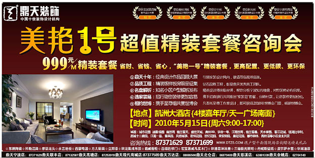 5月15 日(周六)9:00---17:00,鼎天裝飾將在凱洲大酒店(天一廣場(chǎng)南面)四樓嘉年廳舉辦鼎天“美艷1號(hào)”999元/㎡超值精裝套餐業(yè)主咨詢會(huì)和優(yōu)秀家裝作品圖片展,到活動(dòng)現(xiàn)場(chǎng)盡享家裝建材大特價(jià)。