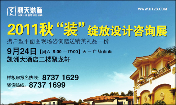 9月24 日(周六)9:00---17:00,鼎天裝飾將在凱洲大酒店(天一廣場南面)二樓聚龍軒舉辦鼎天裝飾2011秋“裝”綻放設(shè)計(jì)咨詢會和優(yōu)秀家裝作品圖片展,到活動現(xiàn)場盡享家裝建材大特價(jià)。