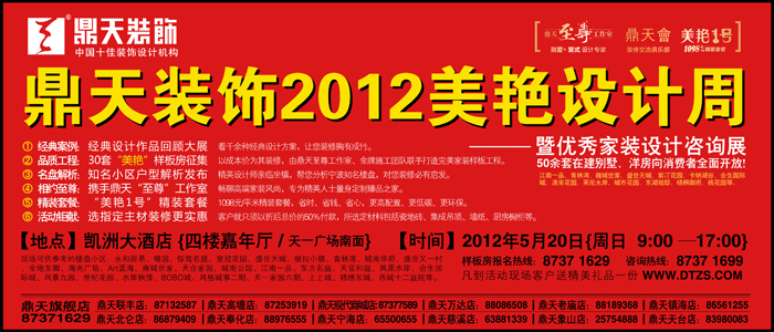 5月20 日(周日)9:00---17:00,鼎天裝飾將在凱洲大酒店(天一廣場(chǎng)南面)四樓嘉年廳舉辦鼎天裝飾2012美艷設(shè)計(jì)周和優(yōu)秀家裝設(shè)計(jì)咨詢(xún)展,到活動(dòng)現(xiàn)場(chǎng)盡享家裝建材大特價(jià)。