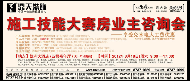 “鼎天裝飾施工技能大賽房”活動是由百余名高端設計師、金牌施工團隊參與,以考量設計、施工、服務等綜合品牌實力為目的一項活動,其最終目的是為消費者提供高品質(zhì)的家居裝修服務,并以此不斷提高自身的軟硬整體實力。8月18日,“2012鼎天裝飾施工技能大賽房業(yè)主咨詢會”活動即將在凱洲大酒店四樓嘉年廳舉行,如果你希望自己的家在裝修后也能入選?。ㄊ校┠酥寥珖膬?yōu)秀裝飾工程(設計)獎項,那么就趕快動起來參加“大賽房”運動吧!