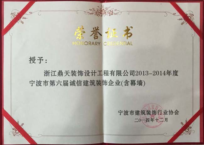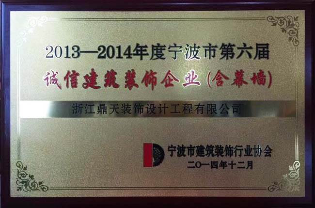 根據(jù)《寧波市建筑裝飾行業(yè)協(xié)會(huì)關(guān)于舉辦2013-2014年度寧波市第六屆誠(chéng)信建筑裝飾企業(yè)評(píng)選活動(dòng)的通知》經(jīng)寧波市建筑裝飾行業(yè)協(xié)會(huì)公開(kāi)、公平、公正的原則,將“寧波市第六屆誠(chéng)信建筑裝飾企業(yè)”頒發(fā)于《浙江鼎天裝飾設(shè)計(jì)工程有限公司》。