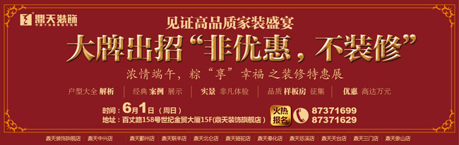 五一的休閑時光已過,端午小長假又將來臨,是否不期然地卻想起了那空置的新房,裝修暗暗浮上心頭。但,又錯過了5.1的各種優(yōu)惠… 6月1日,鼎天裝飾公司各設(shè)計機(jī)構(gòu)將延續(xù)5.1各種給力優(yōu)惠.,強(qiáng)勢推出《大牌出招 “非優(yōu)惠 ,不裝修”》大型主題活動。本次活動,鼎天裝飾特別整合了千余套原創(chuàng)家居設(shè)計作品、百余個主流小區(qū)設(shè)計概念方案,邀請廣大消費者前來品鑒未來家裝樣板生活。同時,活動現(xiàn)場還為待裝修業(yè)主準(zhǔn)備了6大驚喜回饋;如領(lǐng)銜寧波設(shè)計,尊享私人定制、超低價獲得一線品牌建材、下單即可參與抽取免單大獎、簽約再送節(jié)日大禮包、成本價樣板房限量征集等。