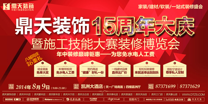 8月9日(周六)9:00---21:00,鼎天裝飾將在凱洲大酒店(天一廣場(chǎng)南面)四樓嘉洲廳舉辦“施工技能大賽房品質(zhì)裝修博覽會(huì)”, 活動(dòng)現(xiàn)場(chǎng)盡享家裝建材大特價(jià)。同時(shí)現(xiàn)場(chǎng)限量征集80套鼎天“比武大賽”樣板房,樣板房不僅享受鼎天15周年大慶裝修特惠,且還為您免去水電人工費(fèi),并由鼎天至尊工作室、金牌施工團(tuán)隊(duì)聯(lián)手打造完美家裝樣板工程。